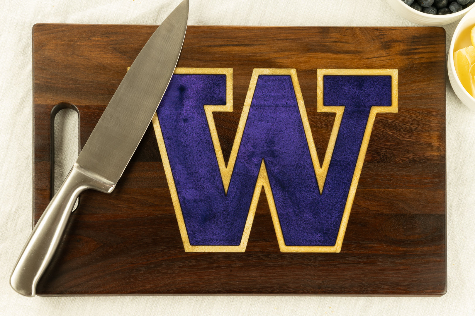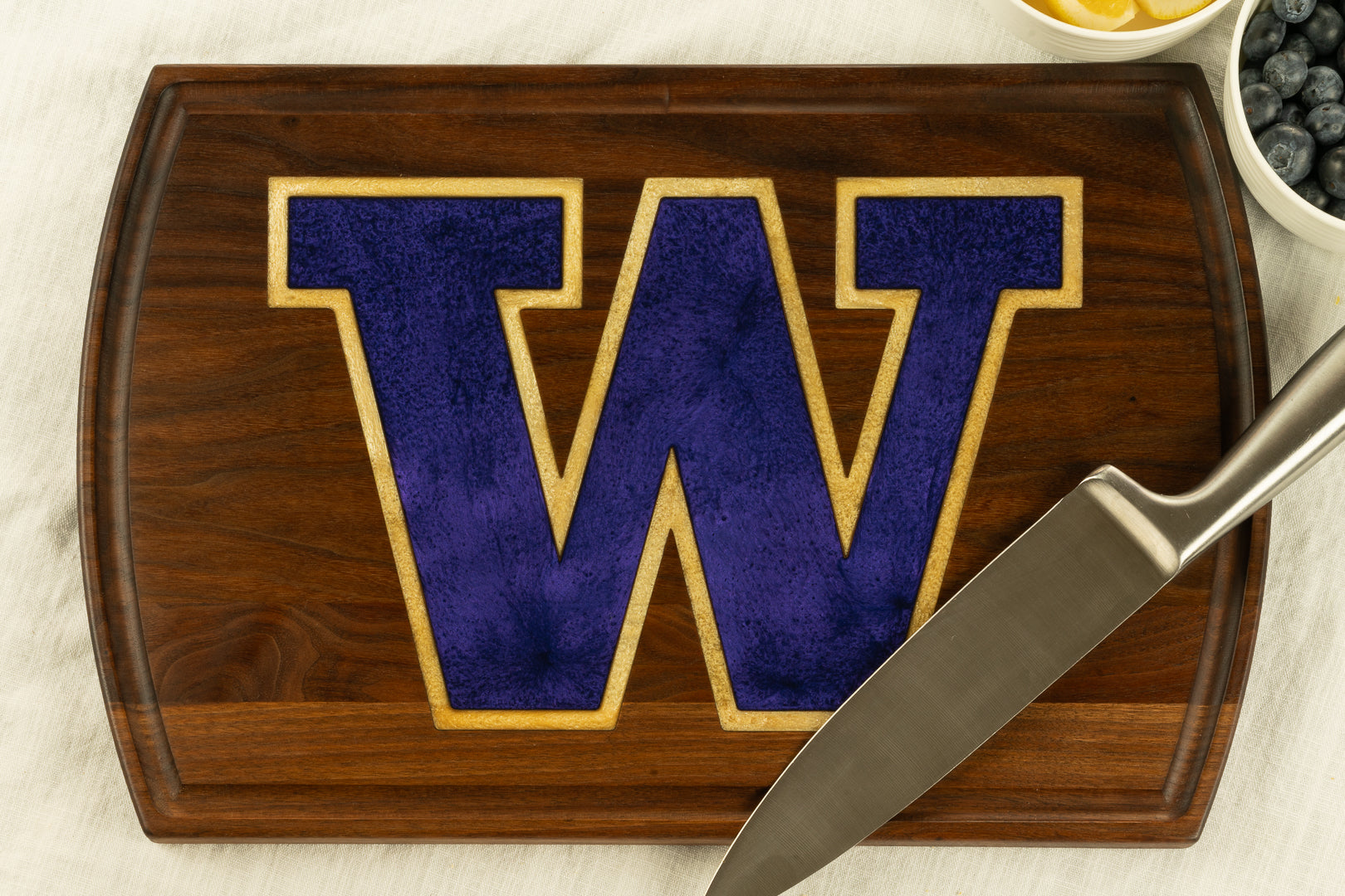 Officially Licensed University of Washington cutting boards. These boards are a great way to show support for UW or make the perfect gift for any Huskies fan. Display the logo on one side and cut on the other side for best results. You can also use the board as a serving board or charcuterie board. We use only high quality hardwoods and FDA approved food safe epoxy. The "W" logo is first engraved, then filled in with a food safe epoxy matching the school's official colors. This ensures a very long life for the cutting board and logo.